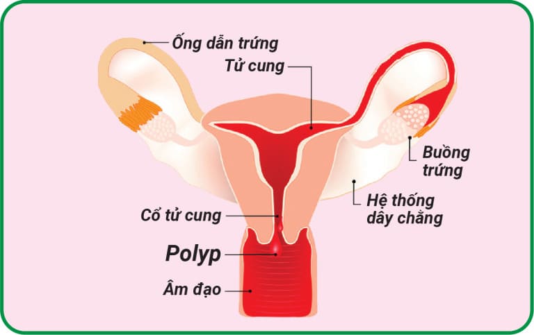 Đây là những khối u phát triển trên cổ tử cung có kích thước từ vài mm đến vài cm. Polyp cổ tử cung thường có cuống và dễ chảy máu khi chạm vào , lành tính, không nguy hiểm và ít khi ảnh hưởng đến việc mang thai và sinh em bé sau này. Tuy nhiên, có một số ít trường hợp, polyp cổ tử cung có thể tiến triển thành ung thư.